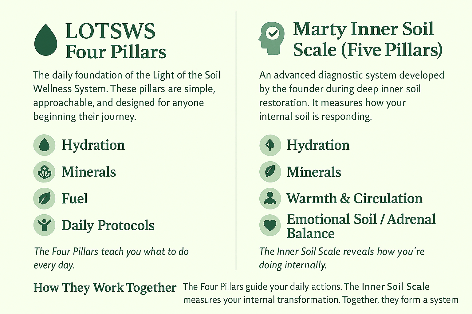 A unifying framework at the heart of the Light of the Soil Wellness System. The Five Roots of Renewal™ explain why LOTSWS works — bringing together hydration, minerals, fuel, warmth, and emotional soil into a single whole-system model for human stability, clarity, and balanced energy.
